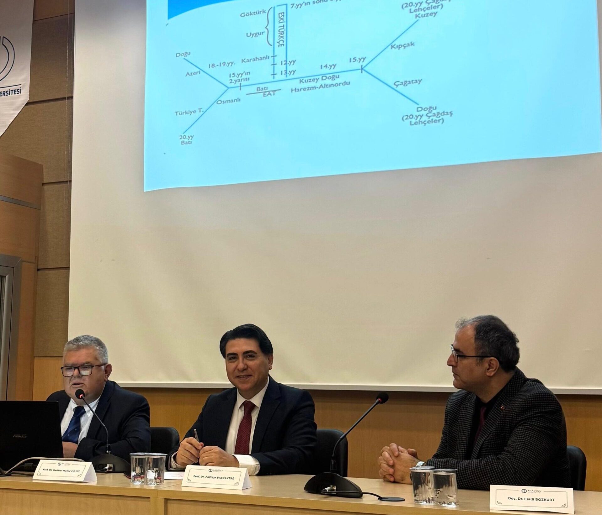 Program kapsamında Prof. Dr. Mehmet Mahur Tulum, “Türk Dilinin ve Türkolojinin Tarihî Gelişimi” başlıklı sunumuyla dinleyicilerle buluştu. Tulum, Türk dilinin tarihsel serüvenini ve Türkoloji alanında ortaya konulan akademik birikimi kapsamlı bir çerçevede ele alarak katılımcılara önemli bilgiler aktardı.