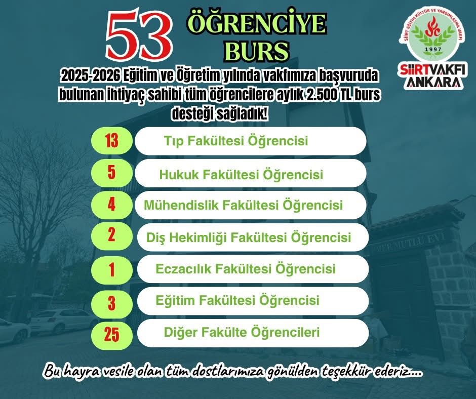 Siirt Vakfı Ankara Şubesi, 2025-2026 eğitim ve öğretim yılı kapsamında ihtiyaç sahibi üniversite öğrencilerine yönelik burs desteğini bu yıl da sürdürüyor. Siirt Vakfı Ankara Şubesi Başkanı Afif Demirkıran, yapılan başvuru değerlendirmeleri sonucunda 53 öğrencinin tamamına aylık 2.500 TL burs desteği verilmesine karar verildiğini açıkladı.